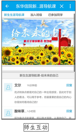 活動自開始以來得到同學們的大力支持,老師在課堂上與同學們共同互動,講解生涯,指導學生,同學們課后在易班上積極留言,談談一節課下來的感悟和收獲,老師通過這些留言了解大家的想法,從而更好地改進教學方式。例如在本期作業:寫給自己未來的話中,同學們紛紛在易班輕應用平臺上留言,寫給未來的自己,夏菡斐老師希望這份作業可以永久保存,等到多年以后,學生們回頭來看當年寫的話,一定會有特別的感觸。
