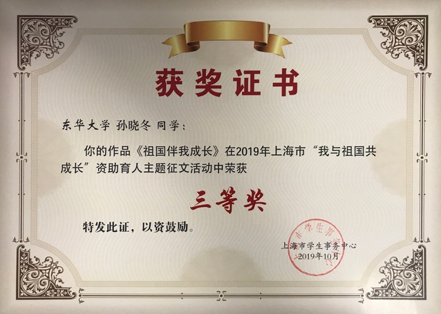 據了解,“主題征文活動”旨在以慶祝新中國成立70周年為主題,通過講述自己在國家資助政策下的成長歷程,激勵廣大學子奮發學習、勇于擔當、積極投身中國夢。征文活動得到了廣大學子的積極響應,共收到投稿70篇,經評選,推薦研究生和本科生作品各1篇參評上海市“我與祖國共成長”主題征文活動。