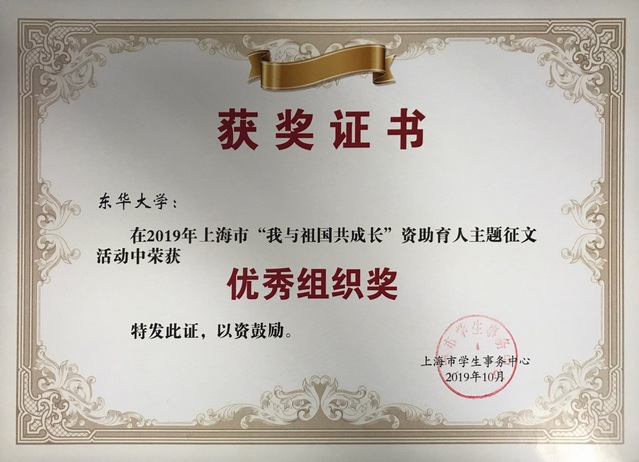 近日,從上海市學生事務中心傳來喜訊,我校環境學院研究生解紫茹同學的《豐羽展翅 翱翔》和人文學院本科生孫曉冬同學的《祖國伴我成長》在上海市2019年“我與祖國共成長”資助育人主題征文活動(簡稱“主題征文活動”)中分獲二、三等獎,我校榮獲優秀組織獎。