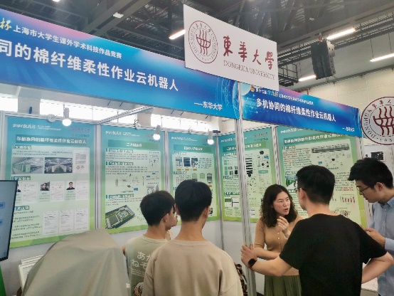 機械學院的“多機協同的棉纖維柔性作業云機器人”項目獲得上海市一等獎。團隊針對智能工廠機器人協同柔性作業的難題,提出了多合一柔性作業末端執行器、氣電協同控制算法、云端調度系統,實現了高質高效協同作業。為智能工廠提供了一種多機協同的“云-邊”互動解決方案,助力中國智造。